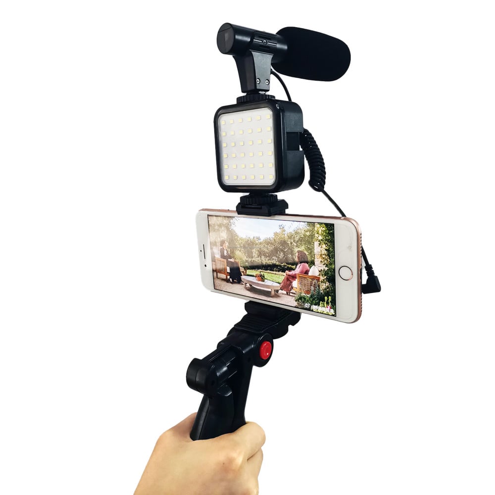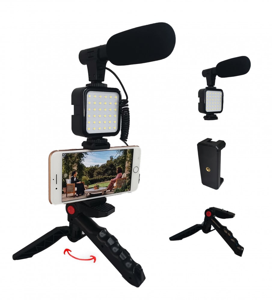يحتوي على مجموعة من الأدوات عالية الجودة لتصوير الفيديوهات، وهي عبارة عن ميكروفون وإضاءة ليد وحامل ثلاثي القوائم للهاتف أو الكاميرا.